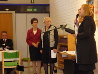 Tanotorviilehden ex-päätoimittaja Kari Varmikko onnittelee palkittuja kerholaisia Kerttu Nurmistoa ja Anja Kyllijokea